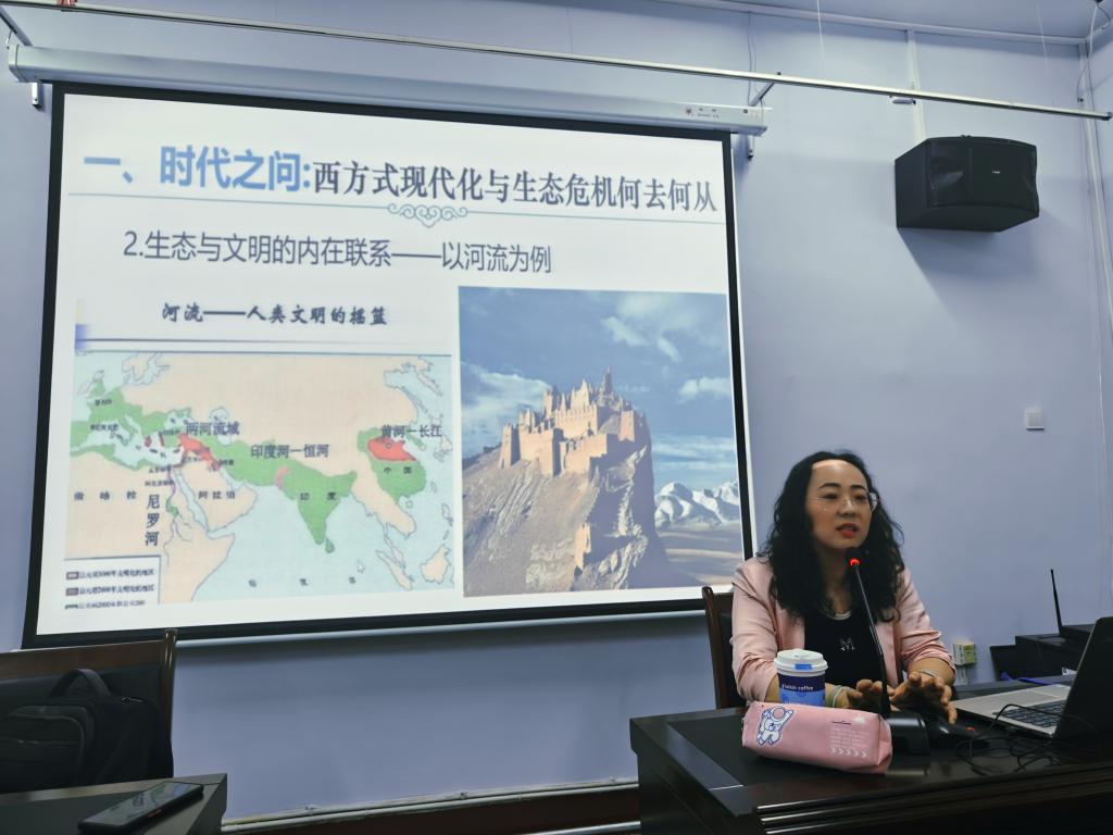 其次宁琳琳副教授从时代之问、中国之智、中国之行、使命之唤等四个方面,深刻阐述了现代化及其全球生态危机何去何从,人与自然和谐共生的现代化新路,以全面绿色转型厚植生态文明基石和书写人与自然和谐共生的内蒙古新篇等生动内容。