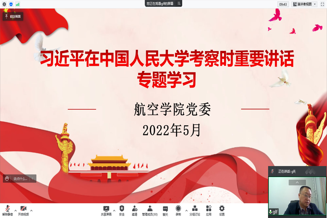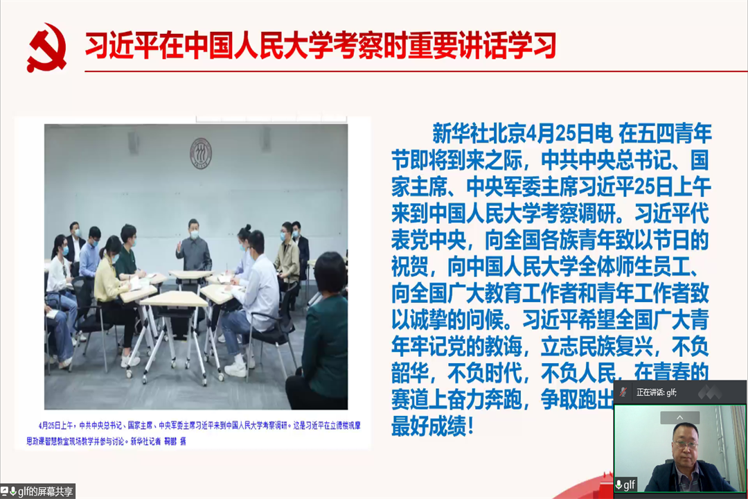 5月5日,ok138cn太阳集团529组织开展《习近平在中国人民大学考察时重要讲话》专题学习。ok138cn太阳集团529全体教师通过线上方式集中学习,学院党委书记郭凌峰主持学习。